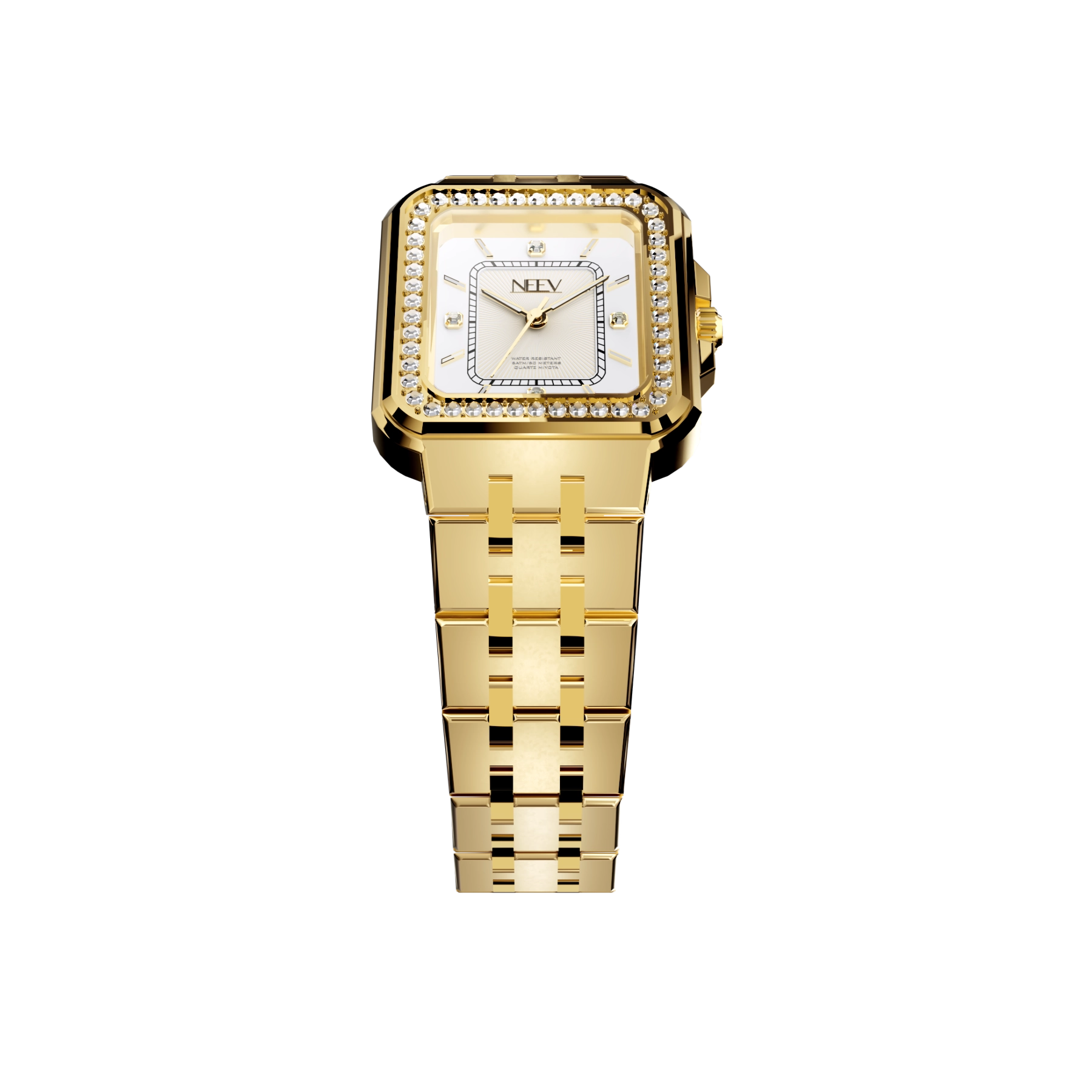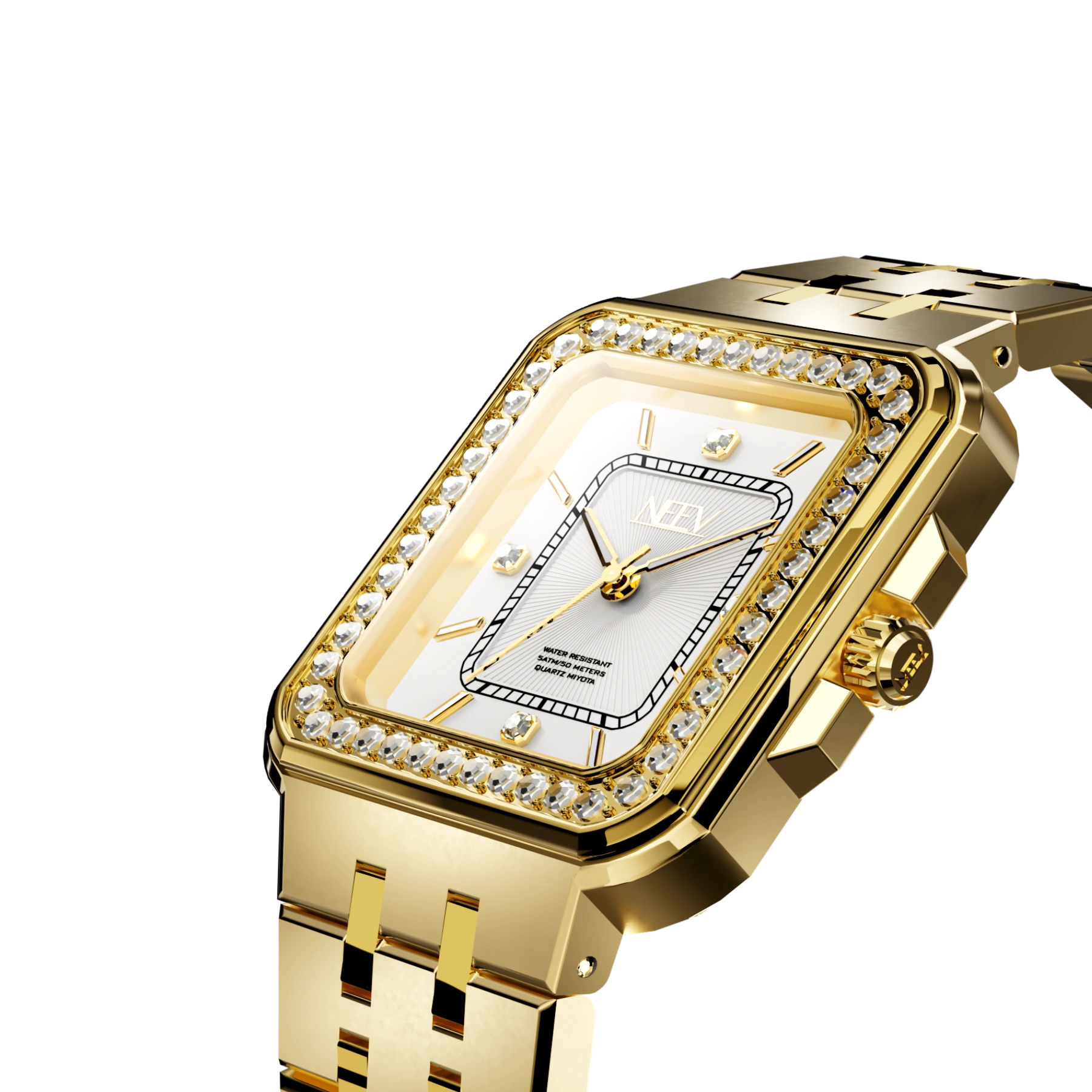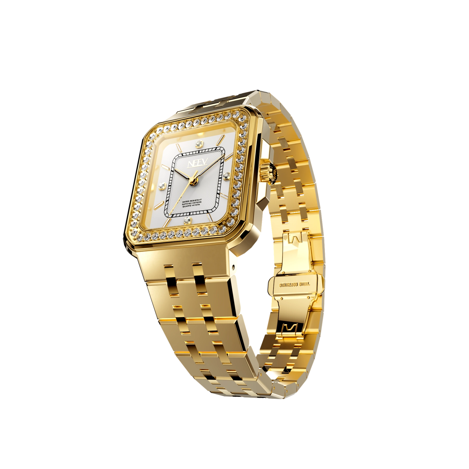 Een vierkante kast bezet met fonkelende zirkonia, hoogwaardig nikkelvrij roestvrij staal, krasbestendig saffierglas met AR-coating en waterbestendig tot 5 ATM. Kortom, het ideale horloge voor de moderne vrouw die haar look graag kracht en stijl meegeeft.