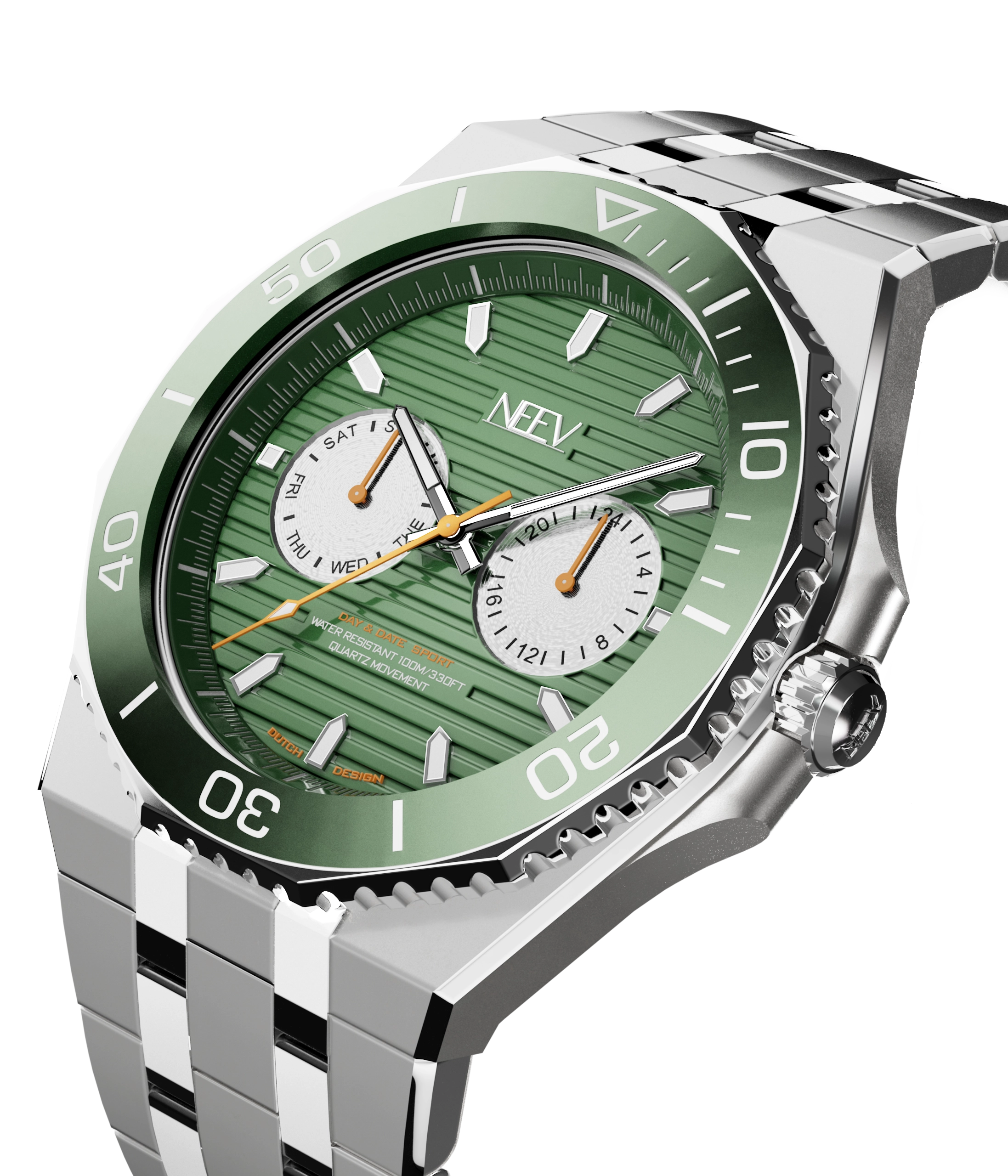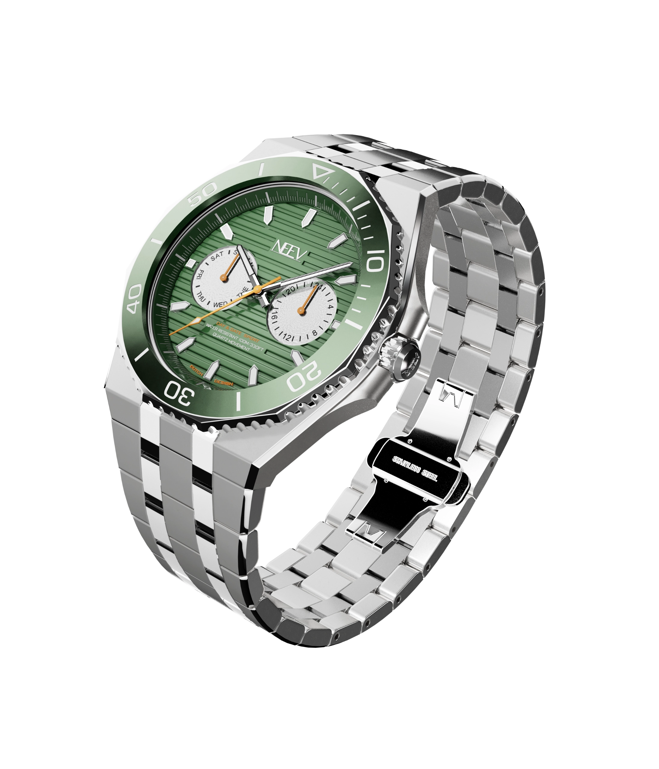 Een geschroefde kroon, waterbestendig tot 100 meter, hoogwaardig nikkelvrij staal, krasbestendig saffierglas en een betrouwbaar Japans uurwerk. Kortom, een krachtig en luxueus horloge die zijn prijsklasse overstijgt.