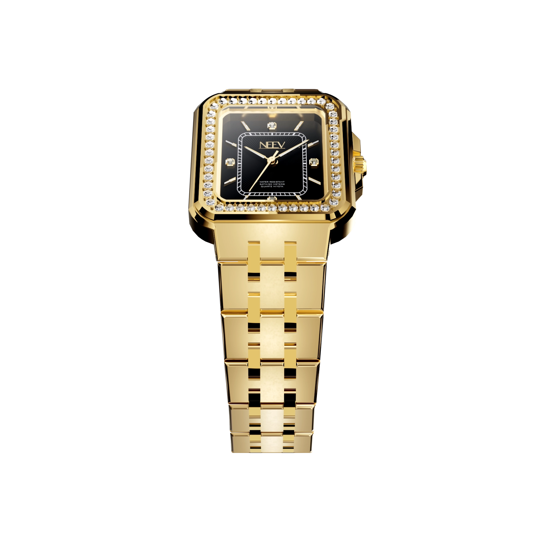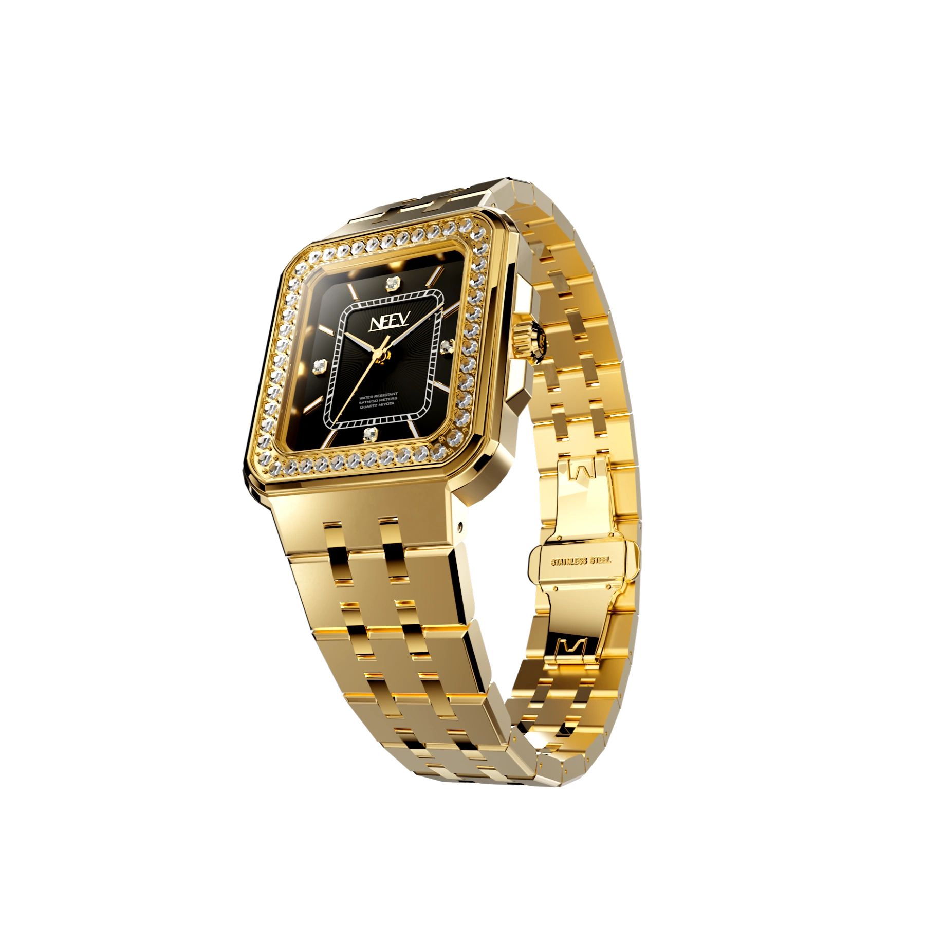 Een vierkante kast bezet met fonkelende zirkonia, hoogwaardig nikkelvrij roestvrij staal, krasbestendig saffierglas met AR-coating en waterbestendig tot 5 ATM. Kortom, het ideale horloge voor de moderne vrouw die haar look graag kracht en stijl meegeeft.