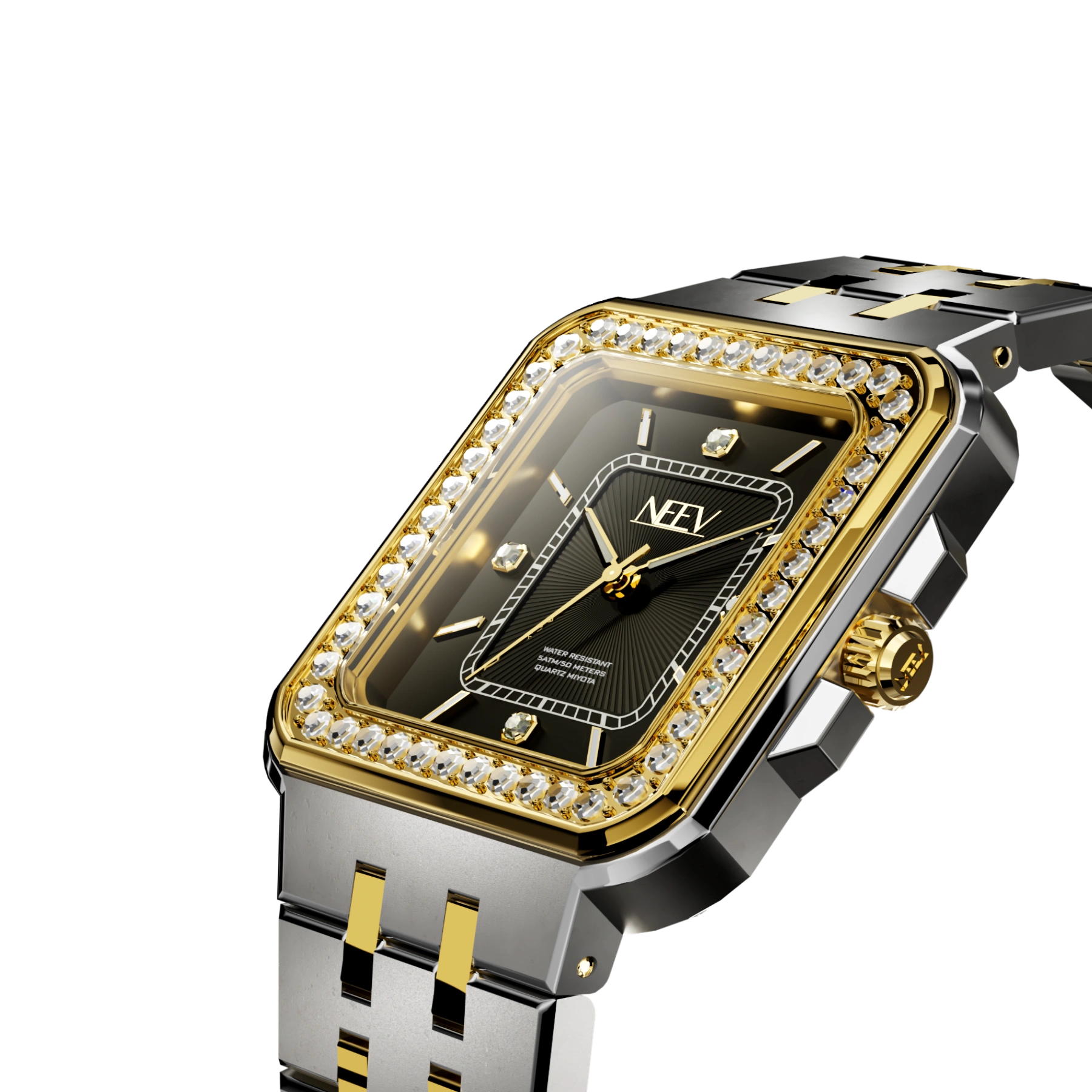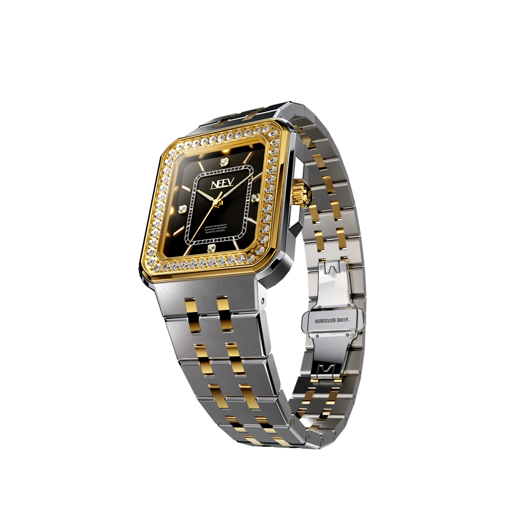 Een vierkante kast bezet met fonkelende zirkonia, hoogwaardig nikkelvrij roestvrij staal, krasbestendig saffierglas met AR-coating en waterbestendig tot 5 ATM. Kortom, het ideale horloge voor de moderne vrouw die haar look graag kracht en stijl meegeeft.