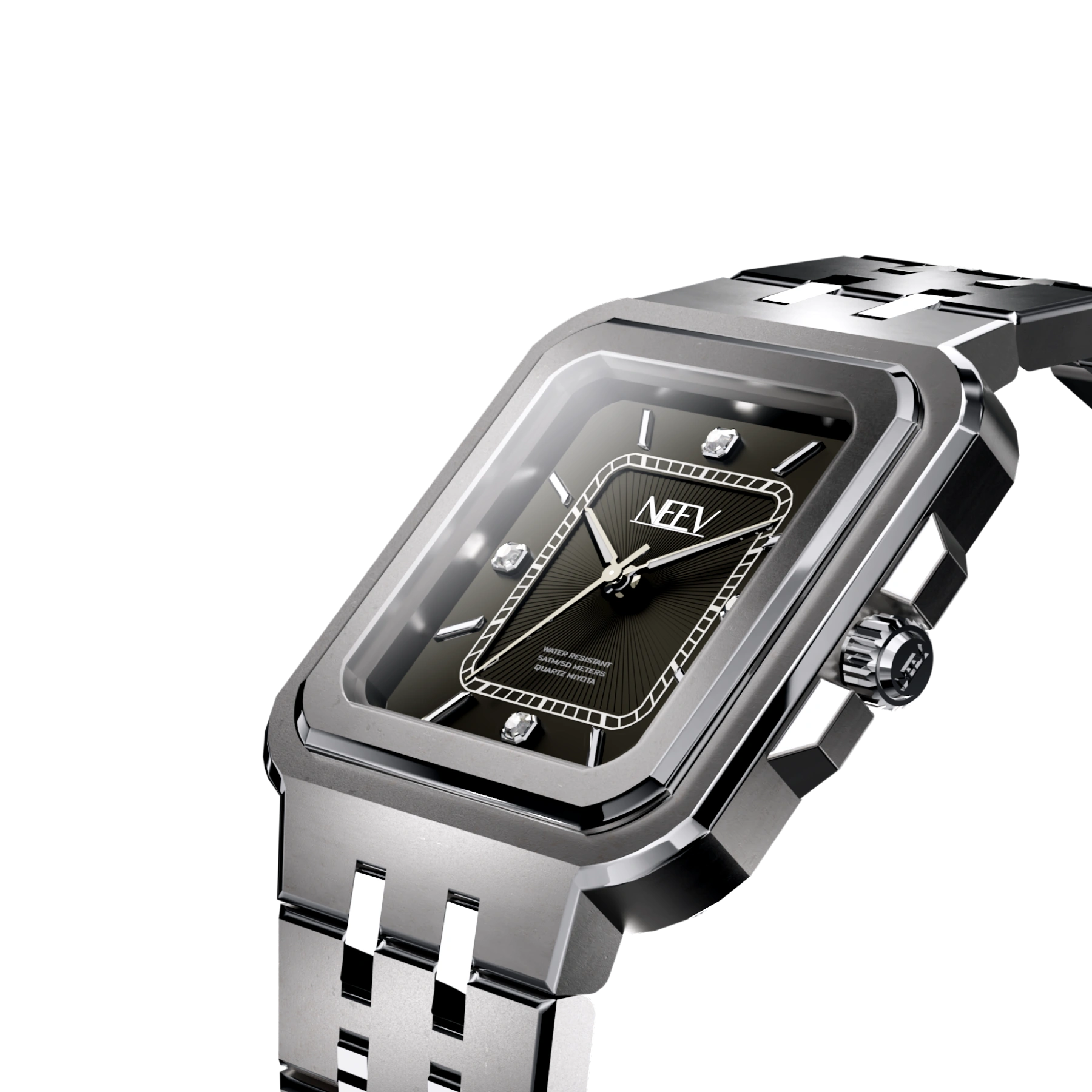 Een strakke vierkante kast met gladde gepolijste bezel, hoogwaardig nikkelvrij roestvrij staal, krasbestendig saffierglas met AR-coating en waterbestendig tot 5 ATM. Kortom, het ideale horloge voor de vrouw die houdt van minimalistische klasse en tijdloos design.