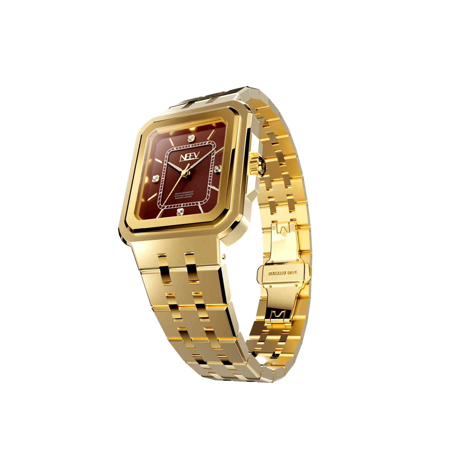 Een strakke vierkante kast met gladde gepolijste bezel, hoogwaardig nikkelvrij roestvrij staal, krasbestendig saffierglas met AR-coating en waterbestendig tot 5 ATM. Kortom, het ideale horloge voor de vrouw die houdt van minimalistische klasse en tijdloos design.