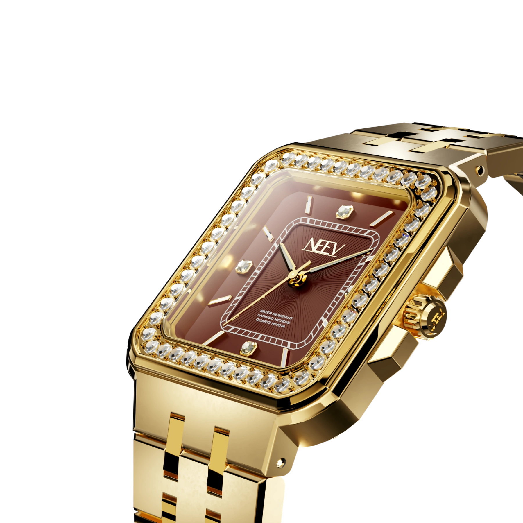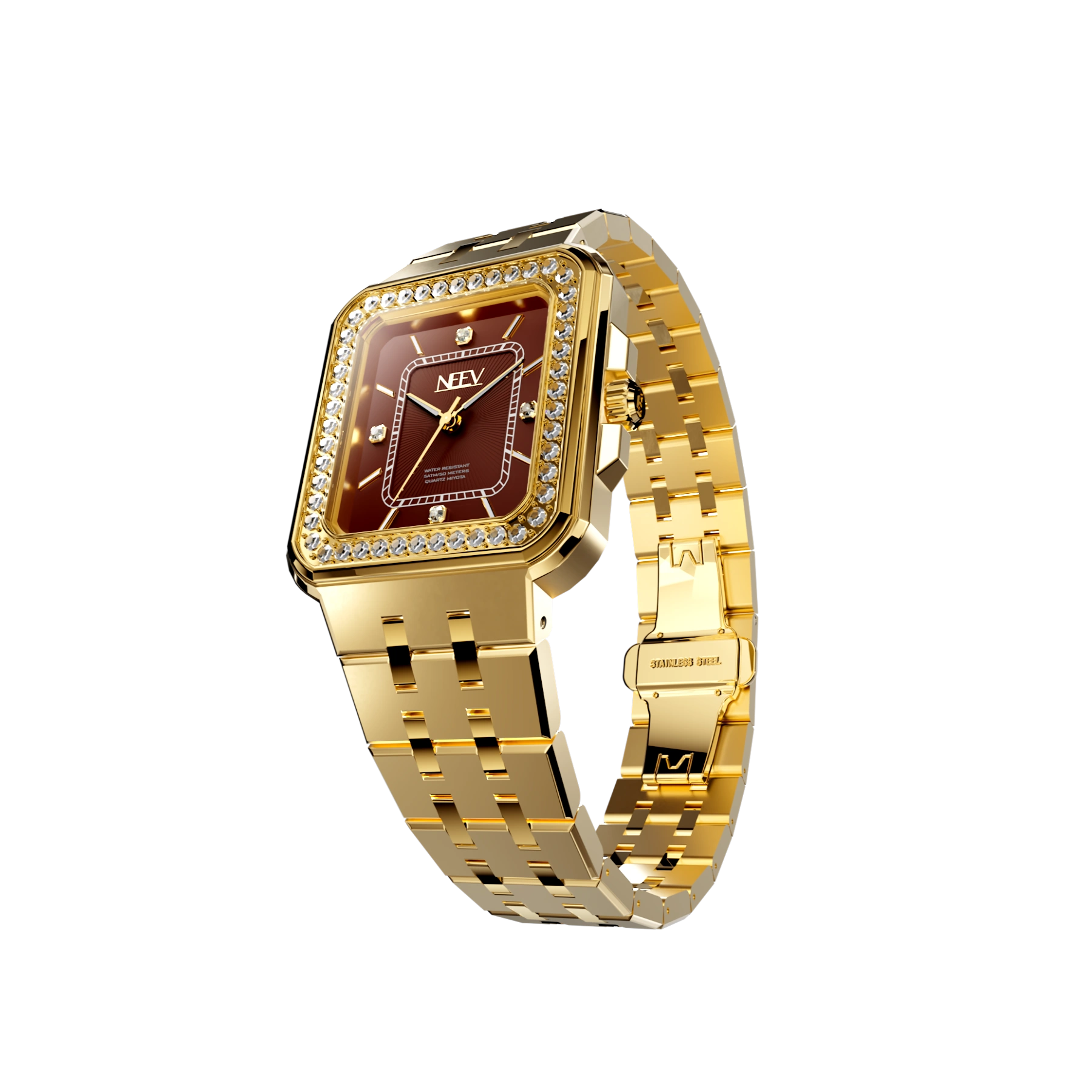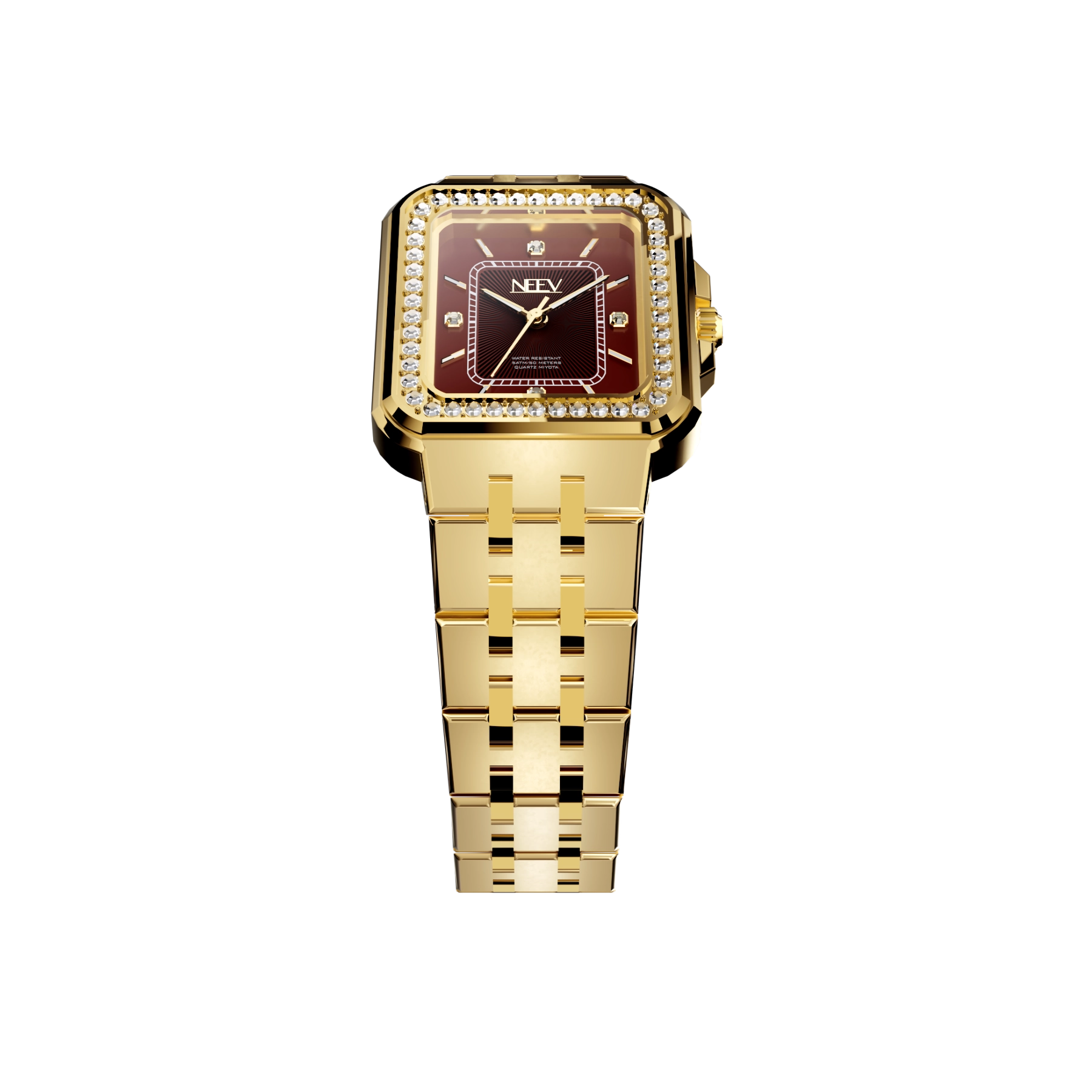 Een vierkante kast bezet met fonkelende zirkonia, hoogwaardig nikkelvrij roestvrij staal, krasbestendig saffierglas met AR-coating en waterbestendig tot 5 ATM. Kortom, het ideale horloge voor de moderne vrouw die haar look graag kracht en stijl meegeeft.