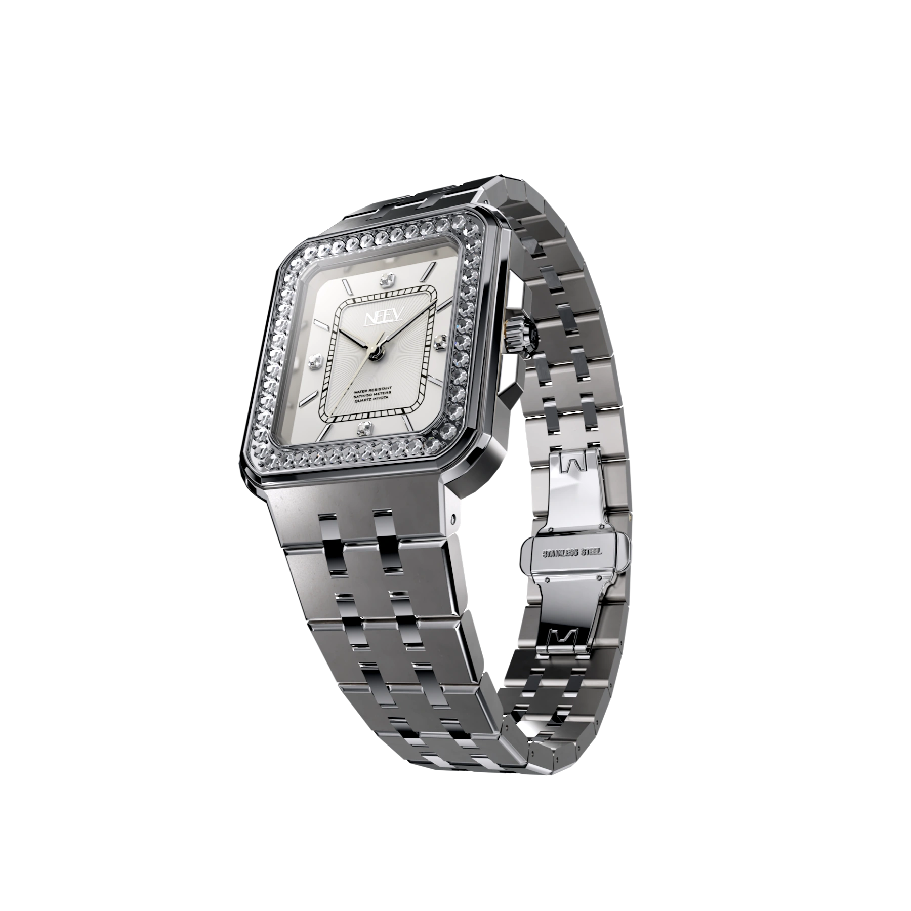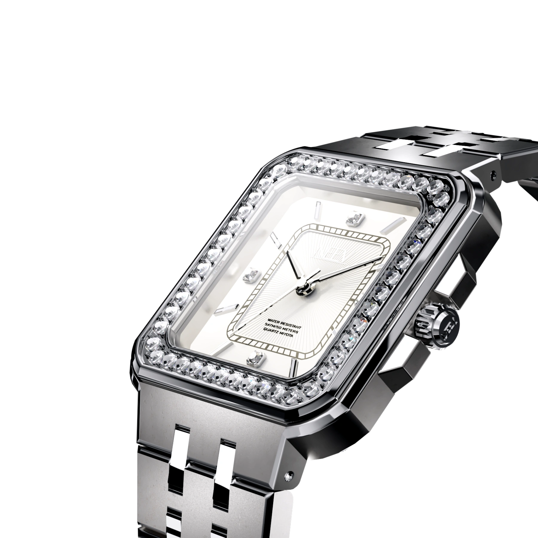 Een vierkante kast bezet met fonkelende zirkonia, hoogwaardig nikkelvrij roestvrij staal, krasbestendig saffierglas met AR-coating en waterbestendig tot 5 ATM. Kortom, het ideale horloge voor de moderne vrouw die haar look graag kracht en stijl meegeeft.