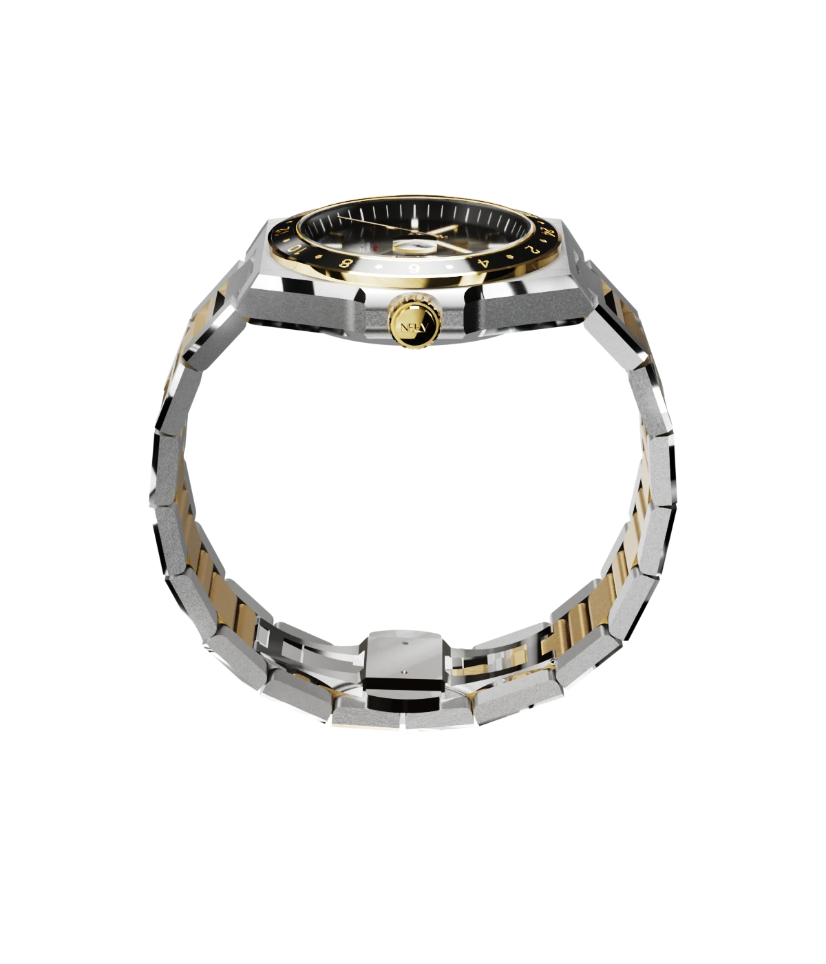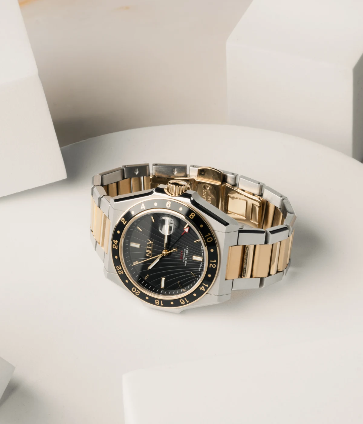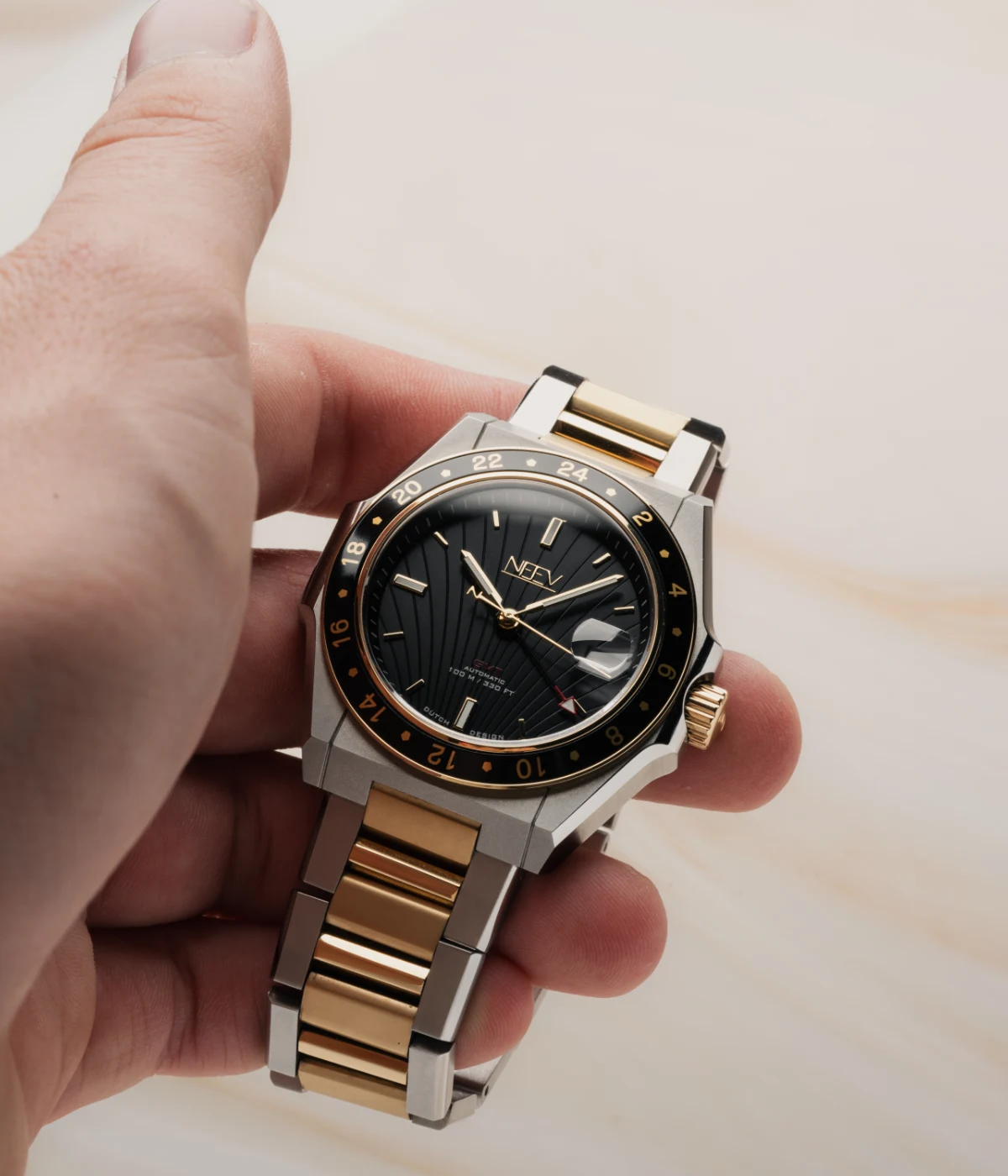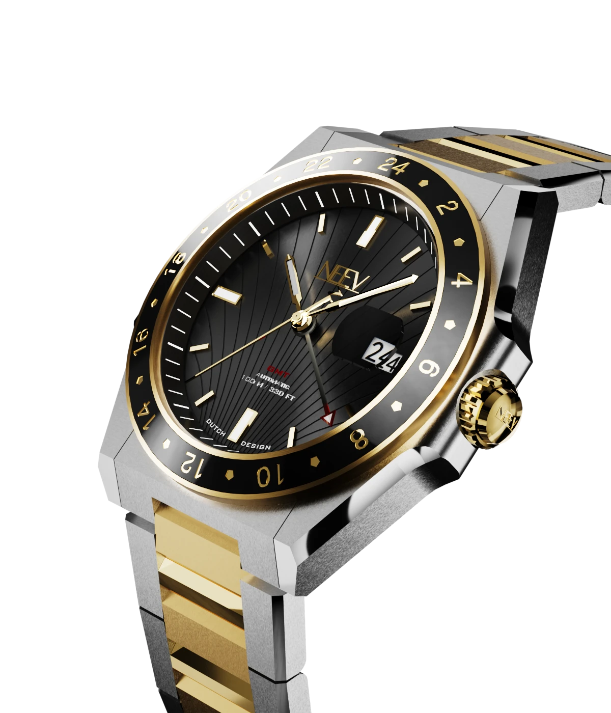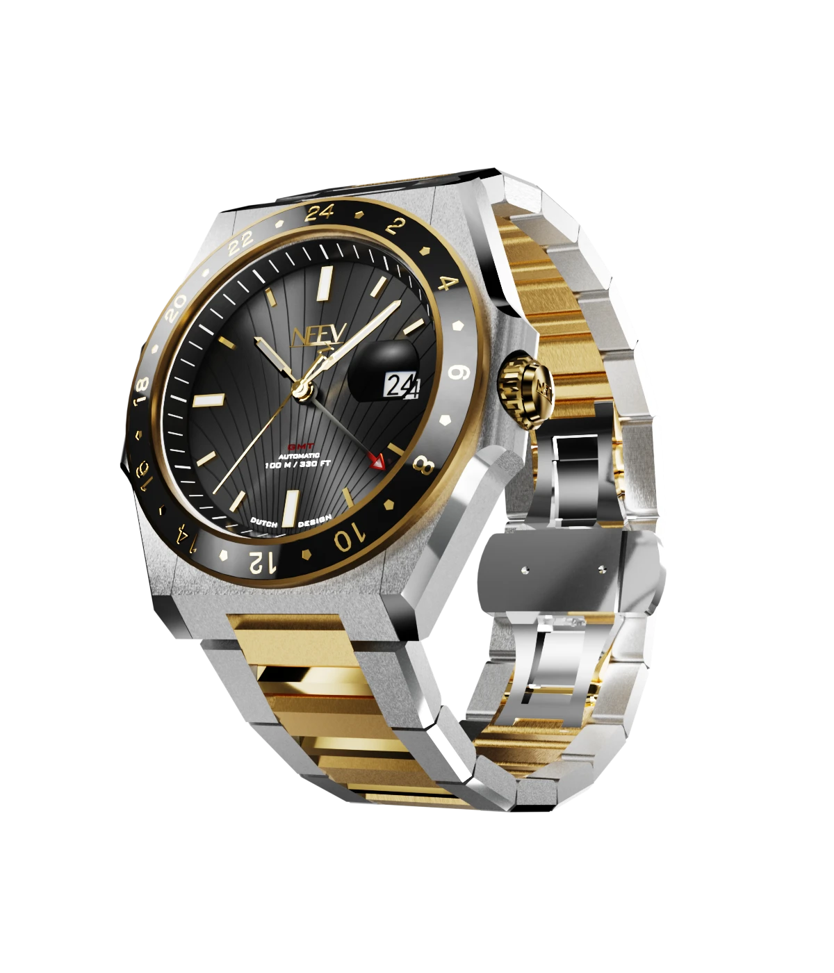 Ontdek de veelzijdigheid van dit prachtige GMT horloge. Dit stijlvolle model is ontworpen voor de reiziger die precisie en elegantie waardeert. De schitterende combinatie van goud en staal en kenmerkende NEEV-details biedt dit horloge niet alleen een tijdloze uitstraling, maar ook de functionaliteit van een tweede tijdzone.