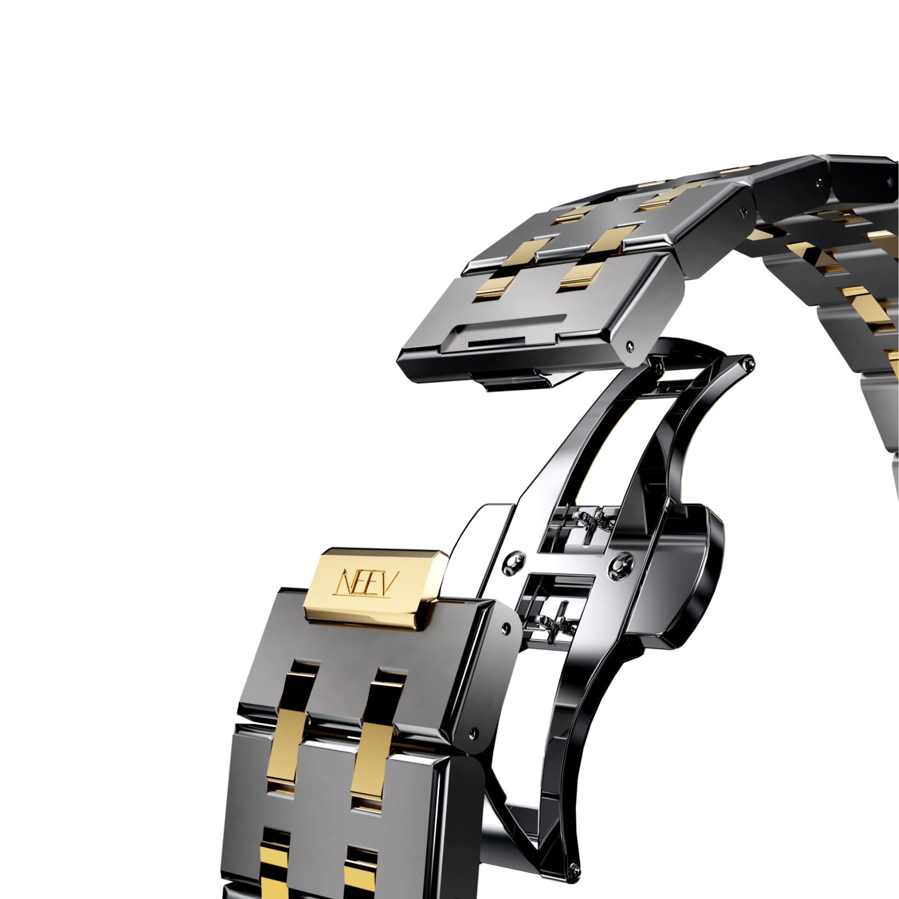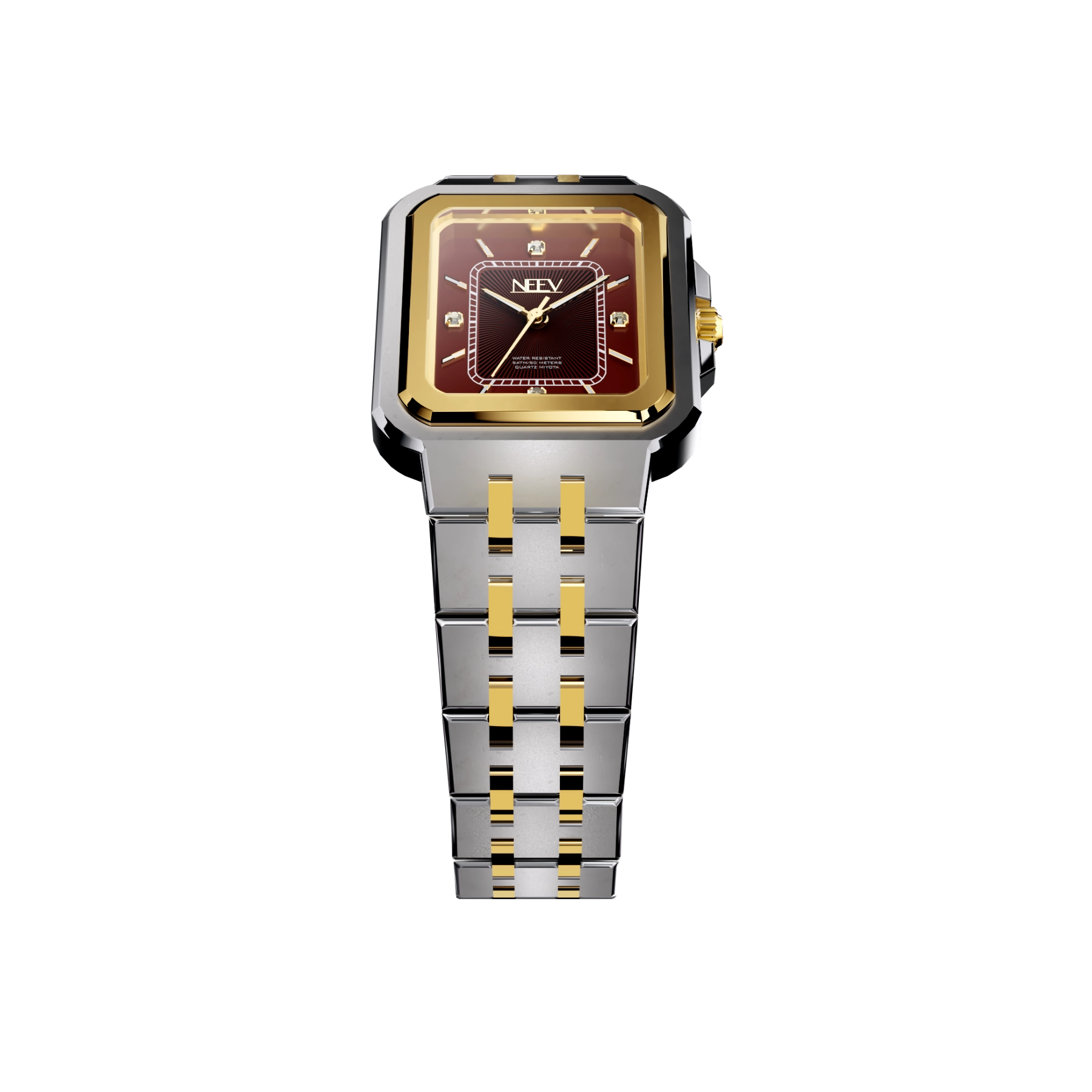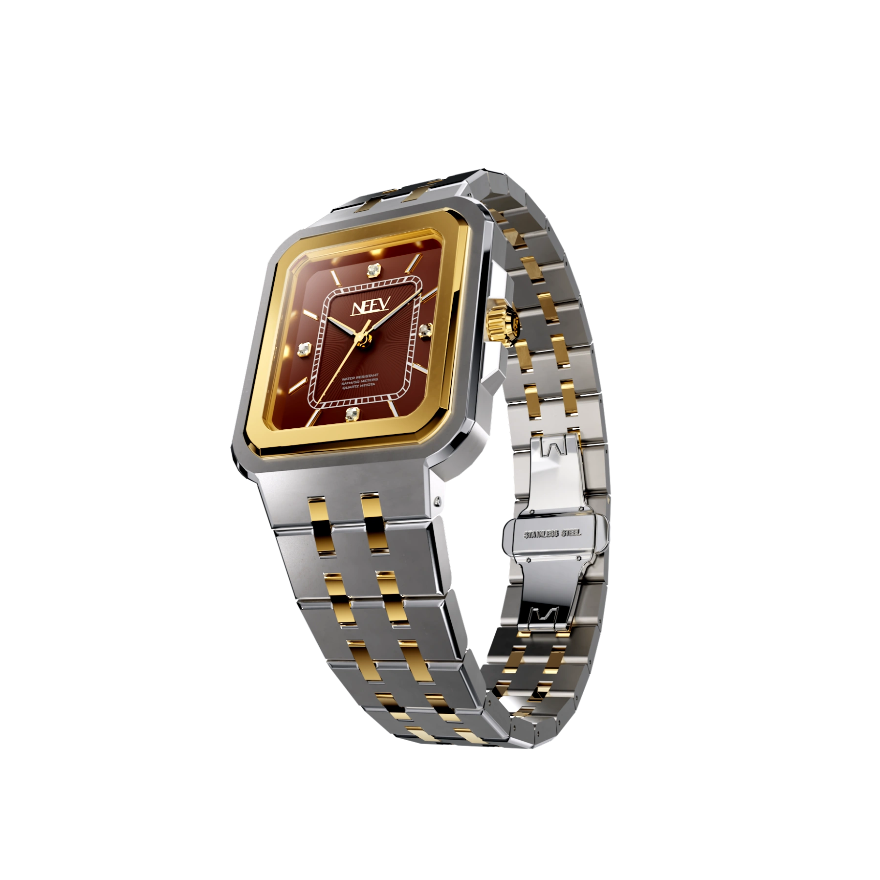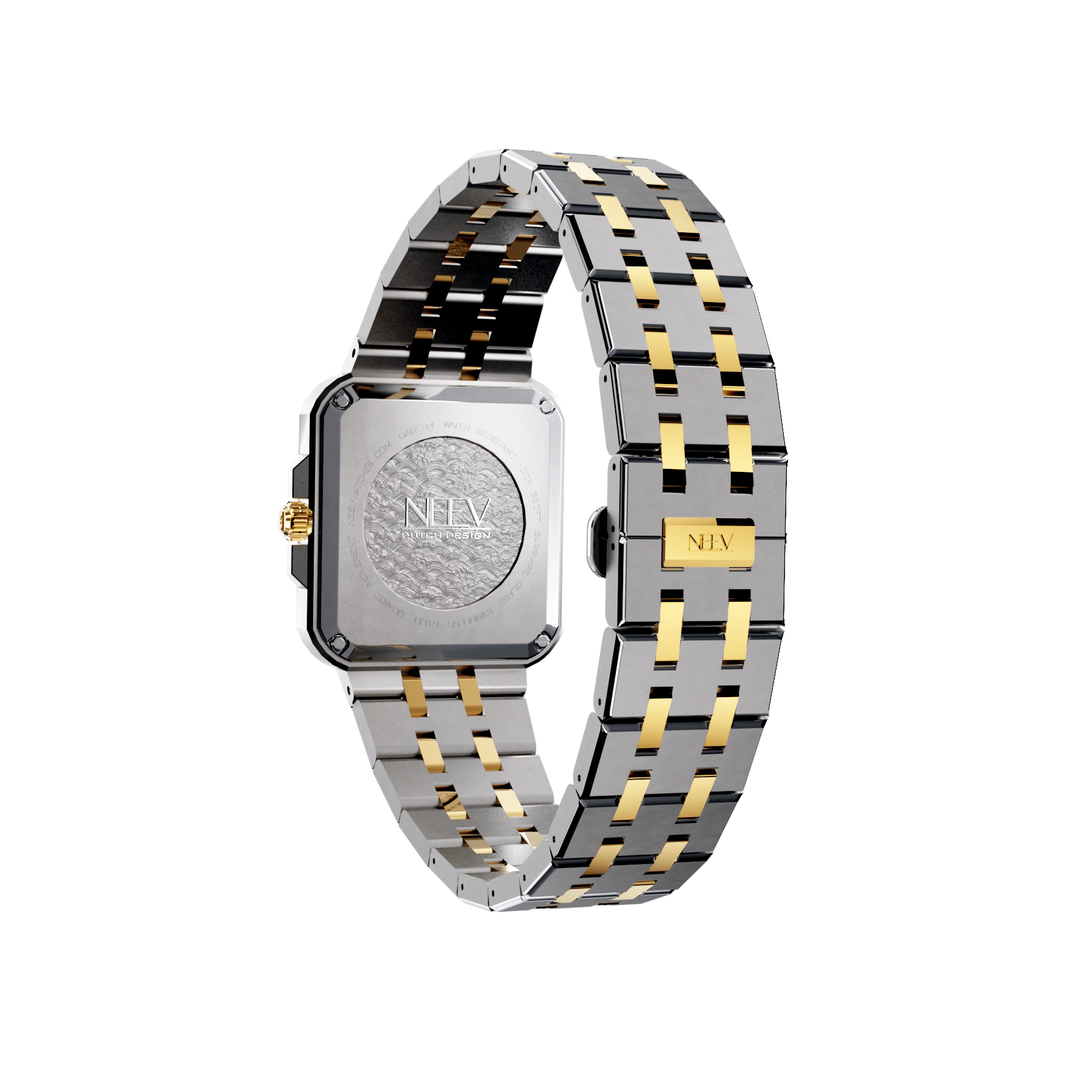Een strakke vierkante kast met gladde gepolijste bezel, hoogwaardig nikkelvrij roestvrij staal, krasbestendig saffierglas met AR-coating en waterbestendig tot 5 ATM. Kortom, het ideale horloge voor de vrouw die houdt van minimalistische klasse en tijdloos design.