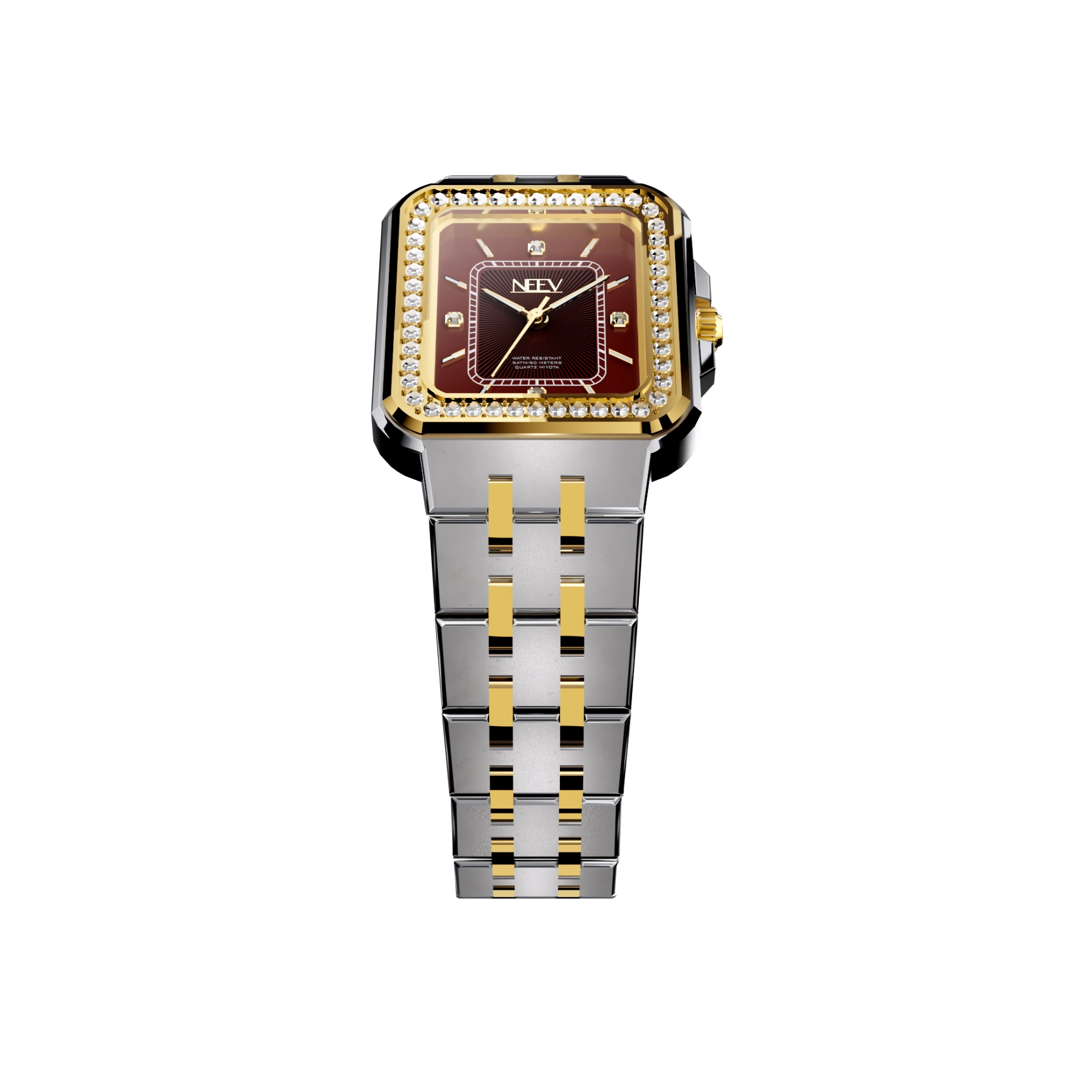 Een vierkante kast bezet met fonkelende zirkonia, hoogwaardig nikkelvrij roestvrij staal, krasbestendig saffierglas met AR-coating en waterbestendig tot 5 ATM. Kortom, het ideale horloge voor de moderne vrouw die haar look graag kracht en stijl meegeeft.